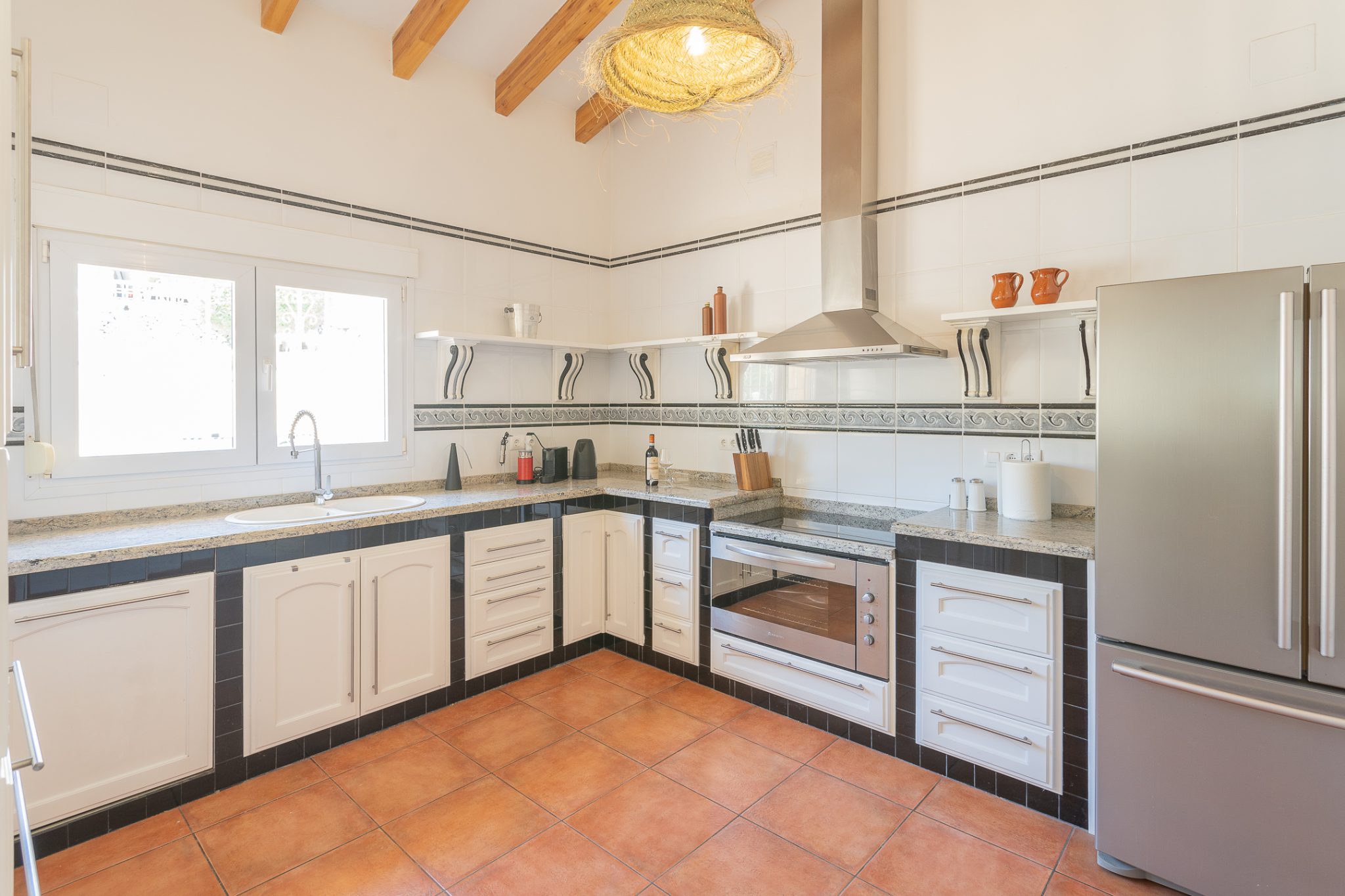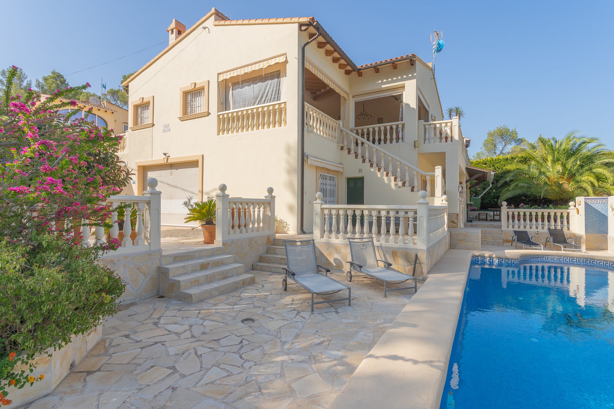 The ground floor includes an open-living with fully equipped kitchen and sofa bed for two persons, two double-bedrooms, two single beds per room, with ceiling fans, a bathroom, a garage and washing area. Outside on the same foor is the pool with sun loungers, an outdoor shower and a bar area. On the top floor you will find the main front-door entrance with also a living area, fully equipped kitchen, bedroom with king-size bed and airconditioner and en-suite bathroom.