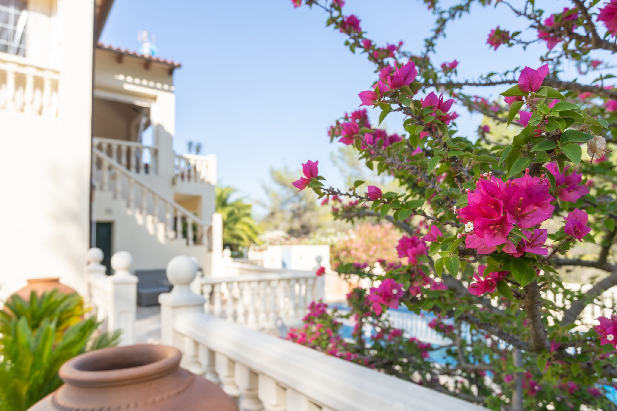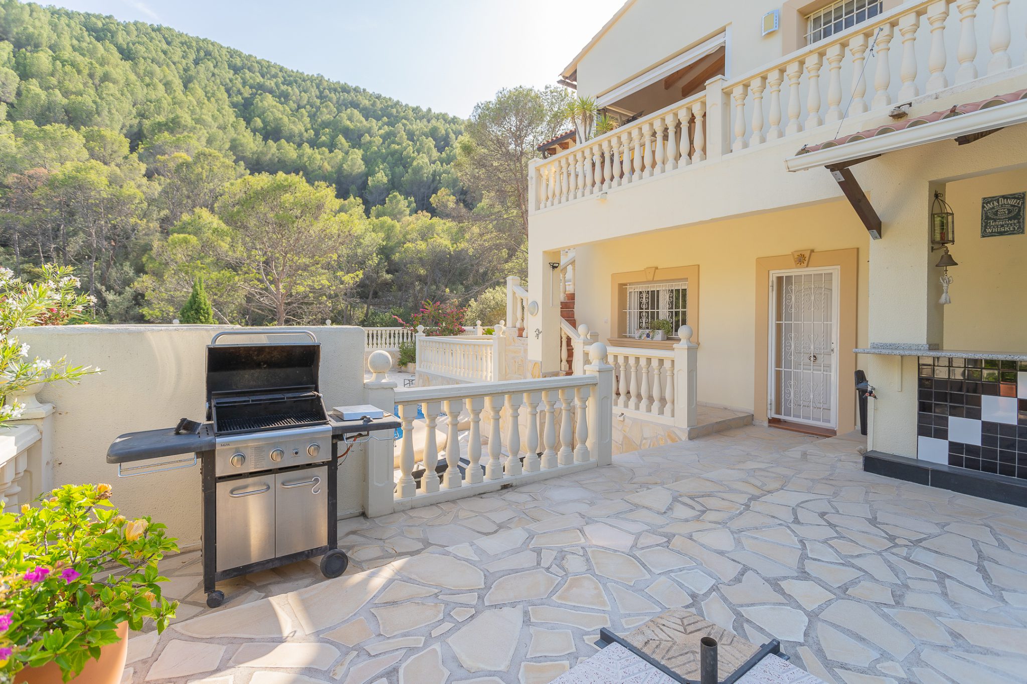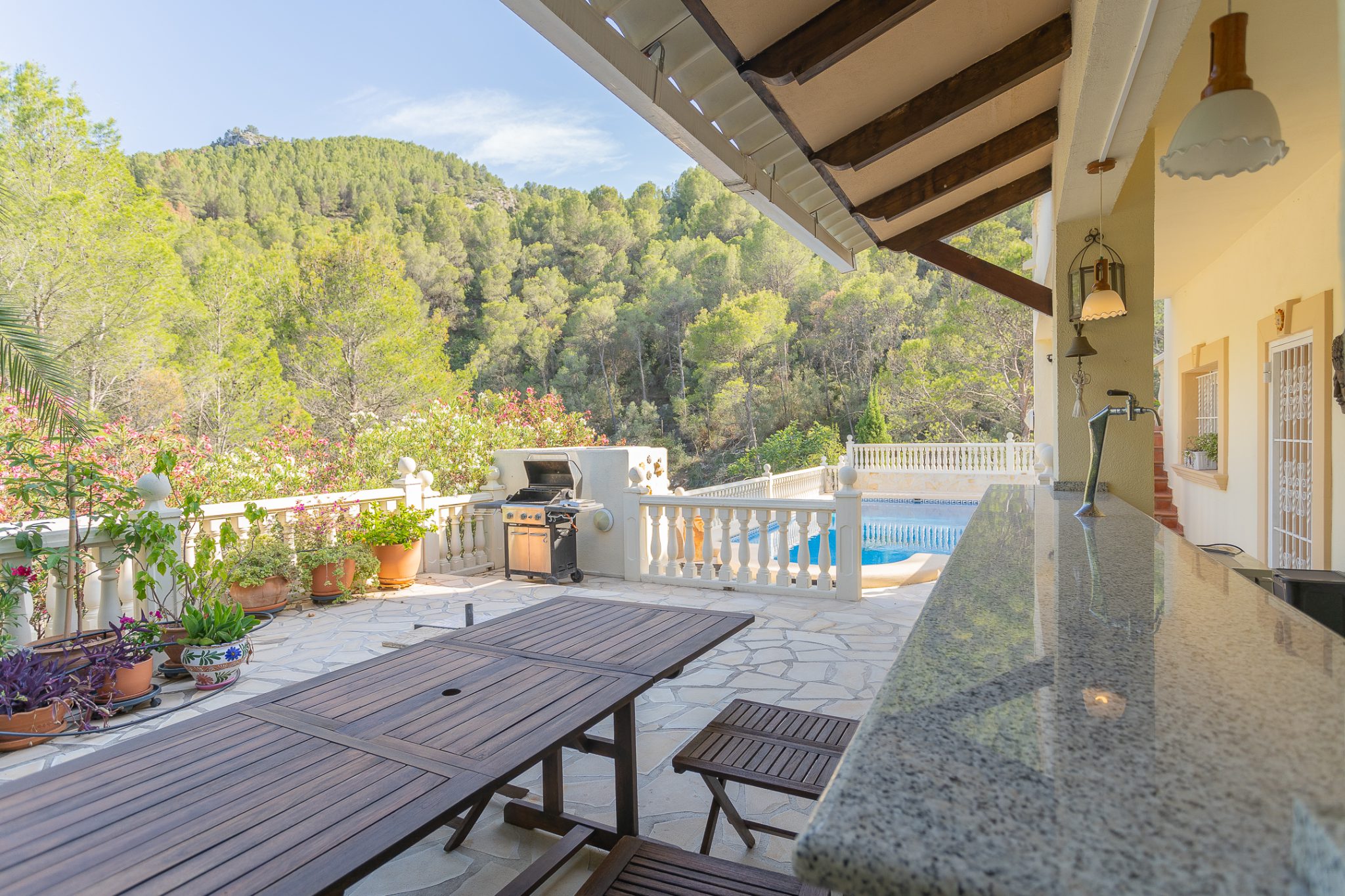 Enjoy meals on one of the several terraces, the front terrace, the covered upper terrace with the scenic view or the pool terrace.