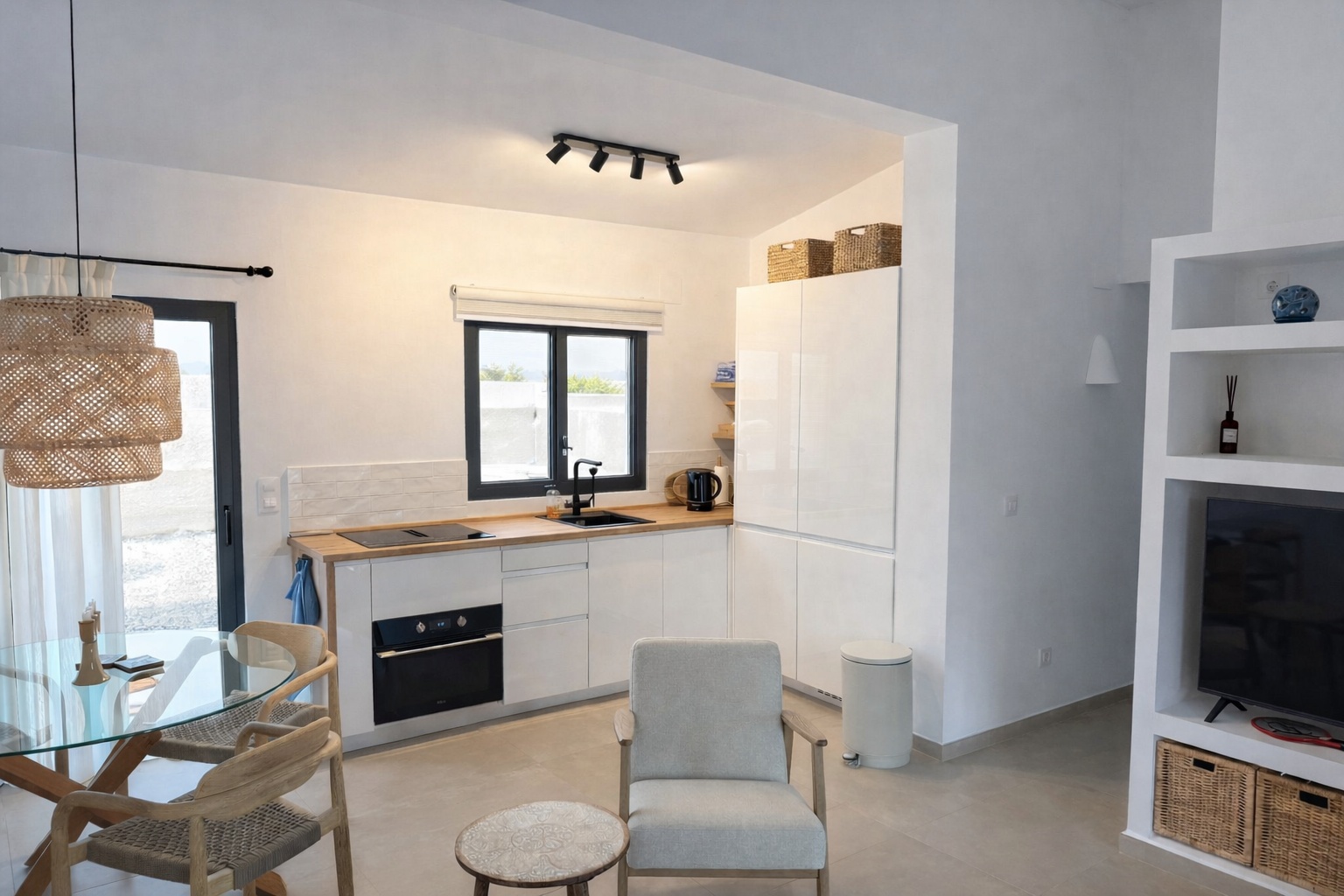 The villa features a living area with kitchen, three bedrooms and two bathrooms. One bedroom and bathroom are part of a separate studio, providing additional privacy within the property. Large doors connect the indoor spaces with the outdoor terraces. This creates a natural transition between indoor and outdoor living.